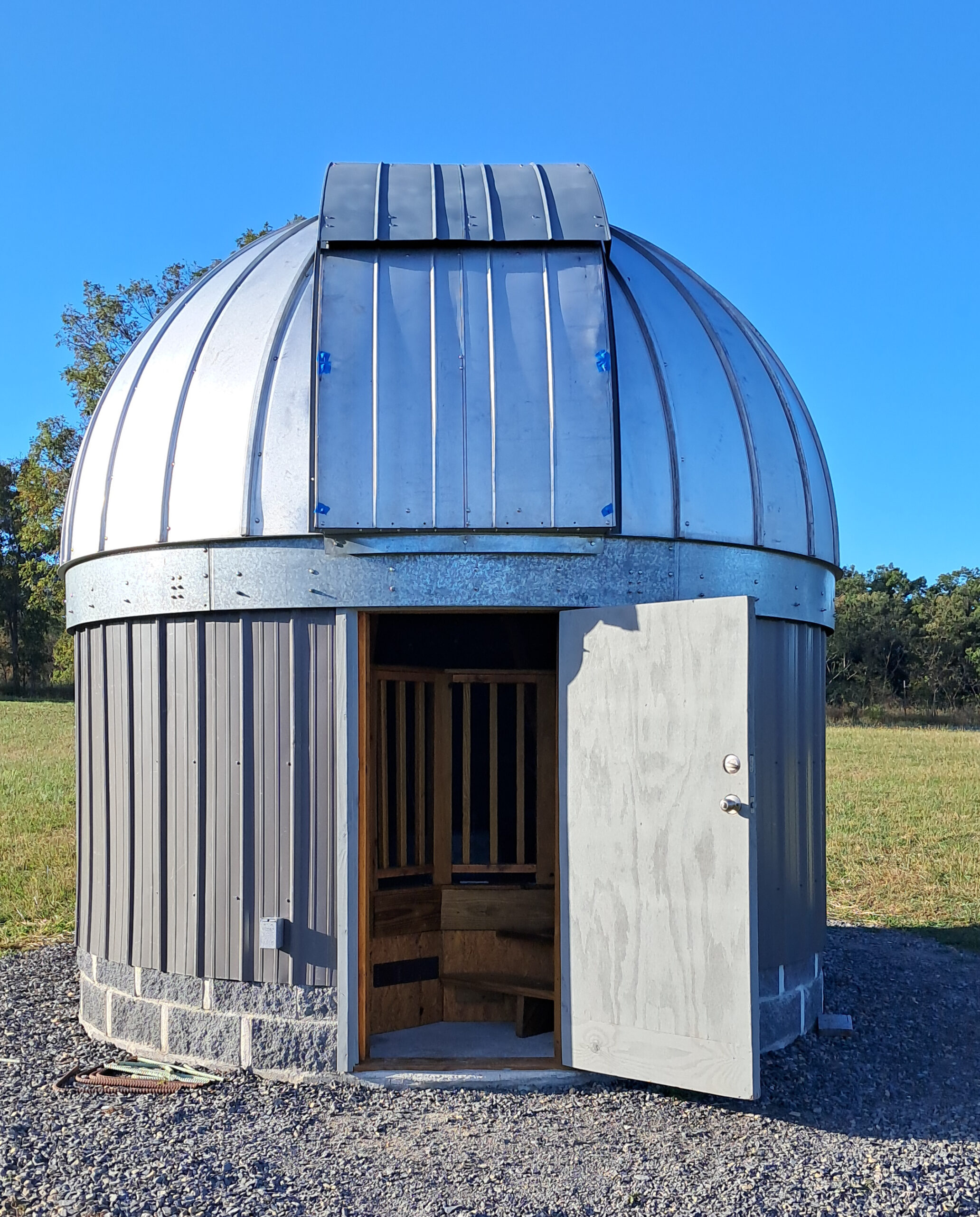 The main structure is a twelve-and-a-half foot diameter Galvalume dome atop a round building with an elevated floor. Another larger building, about 300-feet distant from the dome, serves as a “warm room” and office, with both interconnected via a gigabit network.