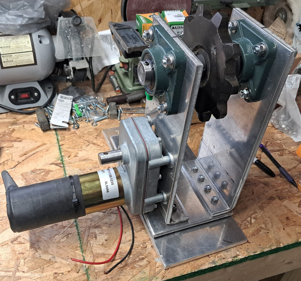 While the Azimuth drive was relatively simple to construct, the shutter drive is a bit more problematic. I couldn’t really wrap my head around what this drive was going to look like until I had completed the dome to the point of sliding the shutter frame in place on top. The Shutter motor and sprocket gear are identical to the azimuth, but I found the gap between the top of the dome and the shutter’s drive track is too wide for this small sprocket to work if it is installed directly onto the motor shaft. And I can’t use a larger sprocket because it would require too large a hole in the dome. So, I decided to again build a mount similar to what Ash shows in their manual. I’ll build this mount with a second shaft for the sprocket at the top, that will be driven by the motor mounted below through a chain drive. In the Ash manual it looks like they used some type of gearbox, but gearboxes can be quite expensive, so I went with the chain drive as a simpler, cheaper option. And it reduces weight.