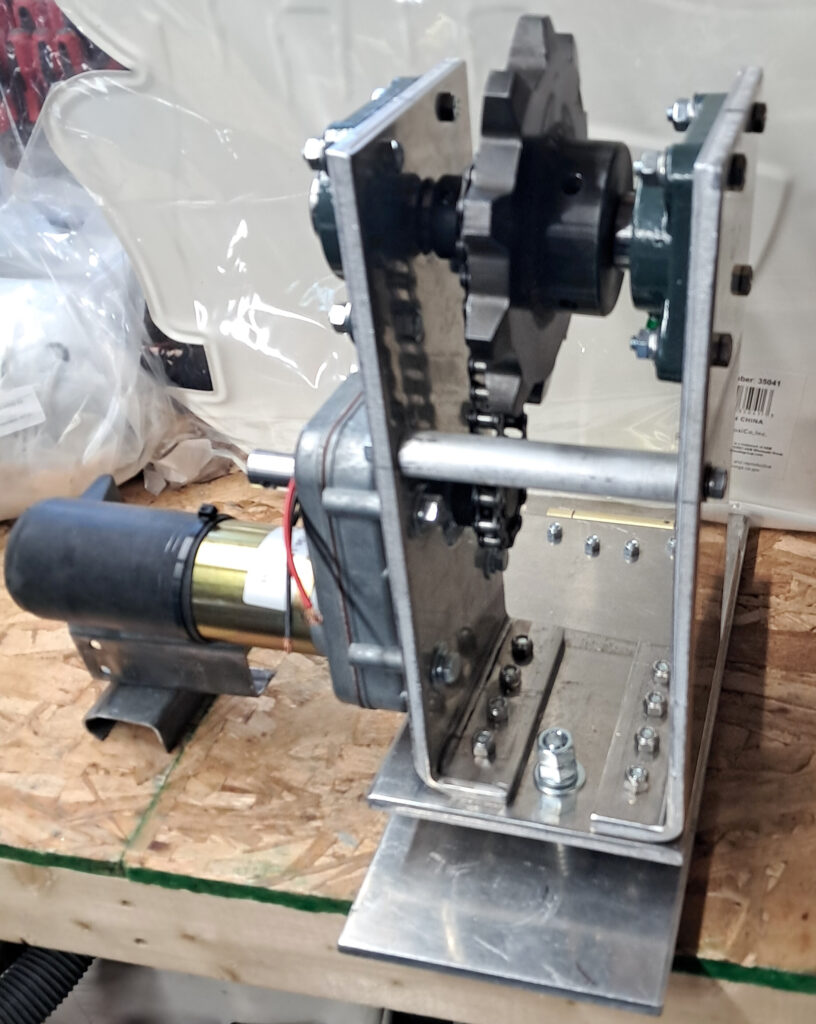 In this photo, drilling and assembling the mount is done, and the motor is bolted in place. The two hinged plates are spring loaded, and all that’s left to do is bolt the mount onto the dome ring, and install the drive sprocket on the front motor shaft. Once it’s manually rotating the dome I’ll make a gray coder to integrate it with the motor drive circuitry.